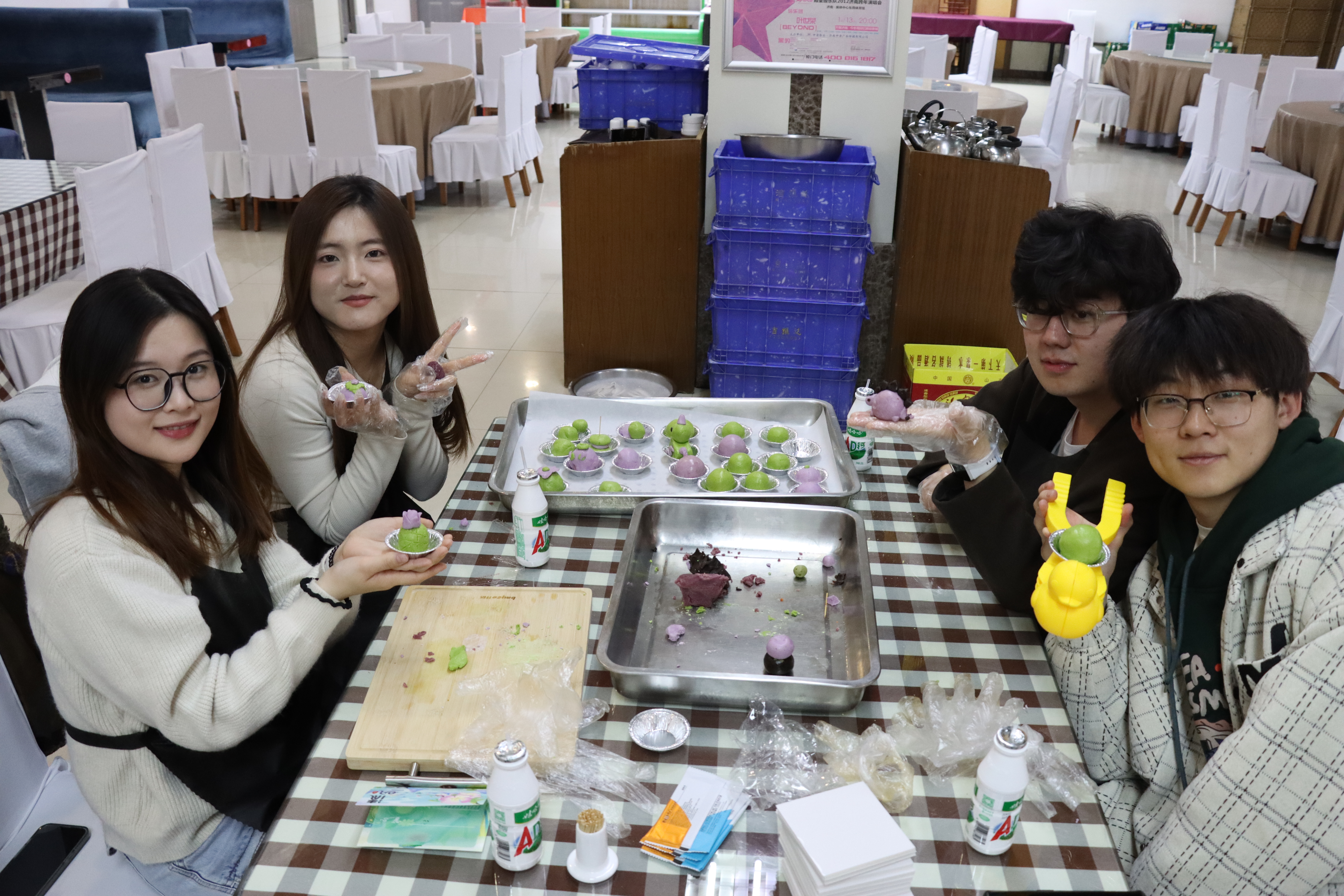 接下来是充满趣味与创意的包青团环节。此次活动共准备了三种馅料和两种饼皮。食堂师傅先做了示范教学,同学们全神贯注,认真学习,很快掌握了技巧。经过一系列的搓揉捻拍,一个个色彩鲜艳、芬芳四溢的青团在同学们的一双双巧手下诞生。同学们还发挥想象力,创造了许多形态各异、浑圆可爱的“刺猬”“小猪”青团。活动现场欢声笑语,热闹非凡,大家其乐融融,忙得不亦乐乎。不一会儿,一个个精美的青团就摆满了整个餐桌。