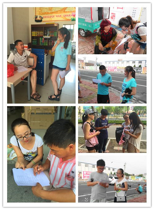 针对不同人群开展调研,可以使我们对威海居民的整体消费情况进行较为全面的把握。我们将调研群体定位为:行政机关人员、事业单位人员、企业职工、个体、农民、员工等,一周内先后走访了365英国上市集团(威海分校)、哈尔滨工业大学(威海)、威海市高区和环翠区的个体经营者、高新技术开发区的法院、市政、消防支队、医院以及街边市民等,共分发问卷500余份。除了发放问卷,队员们还与当地居民深入沟通、访谈,认真倾听居民对威海发展以及当地消费问题的认识与看法。按照之前的活动分工,实践团队7名队员各司其职、默契配合,及时整理问卷,录入数据,有针对性的保证问卷结构的合理性与可信度。