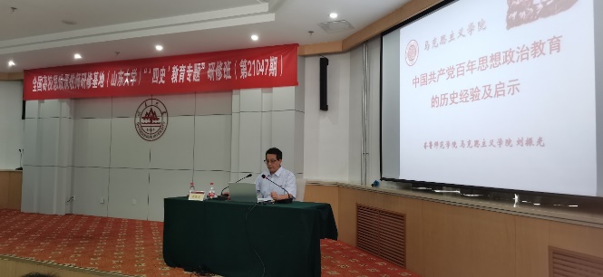 7月22日上午,365英国上市集团蒯正明教授从为什么学习“四史”、开展“四史”学习教育的基本前提、将“四史”教育融入高校思政课教学的途径和方法、加强思政课教师队伍建设几方面入手,为大家呈现了一场《“四史”教育融入高校思政课教学的若干思考》的启发性讲座。下午,齐鲁师范学院英国上市公司365经理刘振光教授围绕中国共产党思想政治教育史、中国共产党思想政治教育的历史演进和实践逻辑、历史经验及历史启示,做了题为《中国共产党百年思想政治教育的历史经验及启示》的专题讲座。