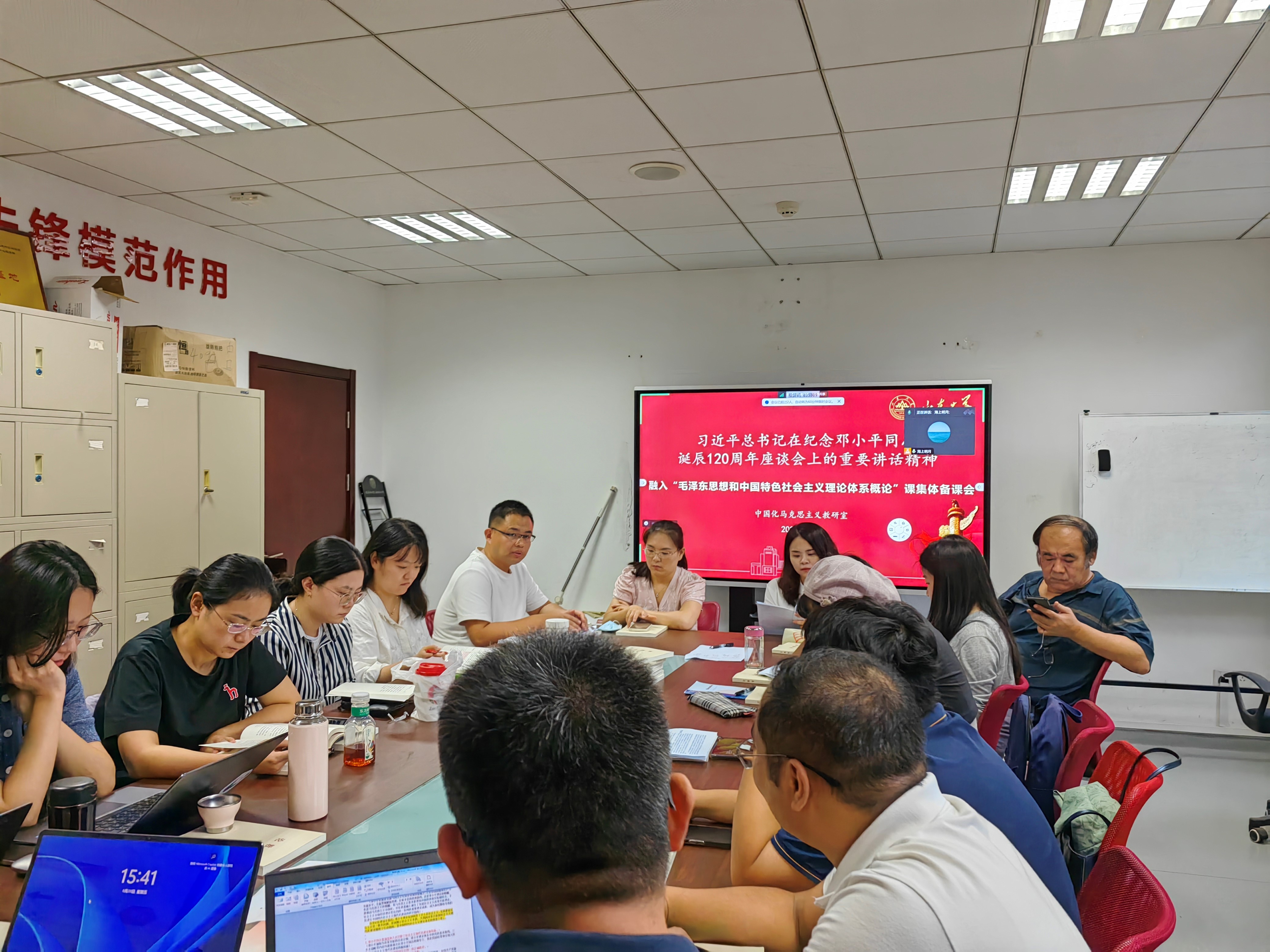 首先,参会教师在会前个人自学的基础上,通过“视频观看+集中领学”的方式,认真学习了习近平总书记在纪念邓小平同志诞辰120周年座谈会上的重要讲话精神。李磊在领学时表示,习近平总书记的重要讲话深情回顾了邓小平同志的一生,高度评价了邓小平同志的历史功勋,深刻阐述了邓小平理论的历史地位、科学内涵、核心要义,强调必须继续深入学习运用邓小平理论,以中国式现代化全面推进强国建设、民族复兴伟业。大家一致认为,习近平总书记的重要讲话高屋建瓴、立意深远、内涵丰富,对于不断提高思政课的针对性和吸引力具有重要价值,为讲好“概论”课尤其是讲好“概论”课中的“邓小平理论”专题提供了科学遵循。大家纷纷表示,要认真学习领悟习近平总书记的重要讲话精神,并融入“概论”课教学,助力提升高校思政课育人质量。