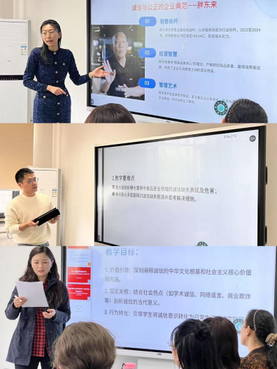 在集体备课展示环节,教师代表韩萌、郁有凯、刘佳围绕诚信主题进行教学展示。