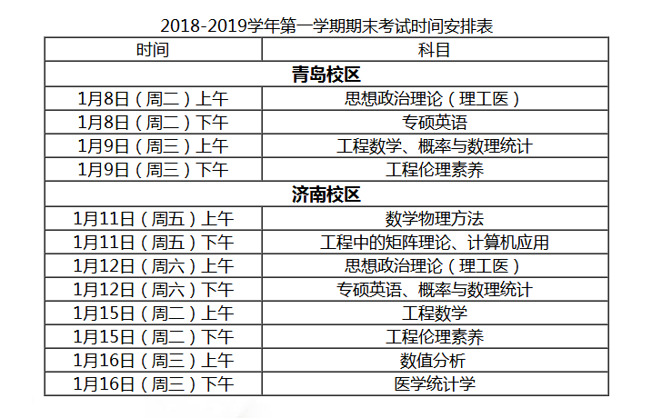 为方便师生提前安排复习、购票等事宜,现将2018-2019学年第一学期期末考试时间提前公布如下,具体考场及其他考试信息另行通知。
