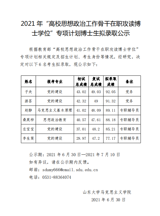 2021年“高校思想政治工作骨干在职攻读博士学位”专项计划博士生拟录取公示