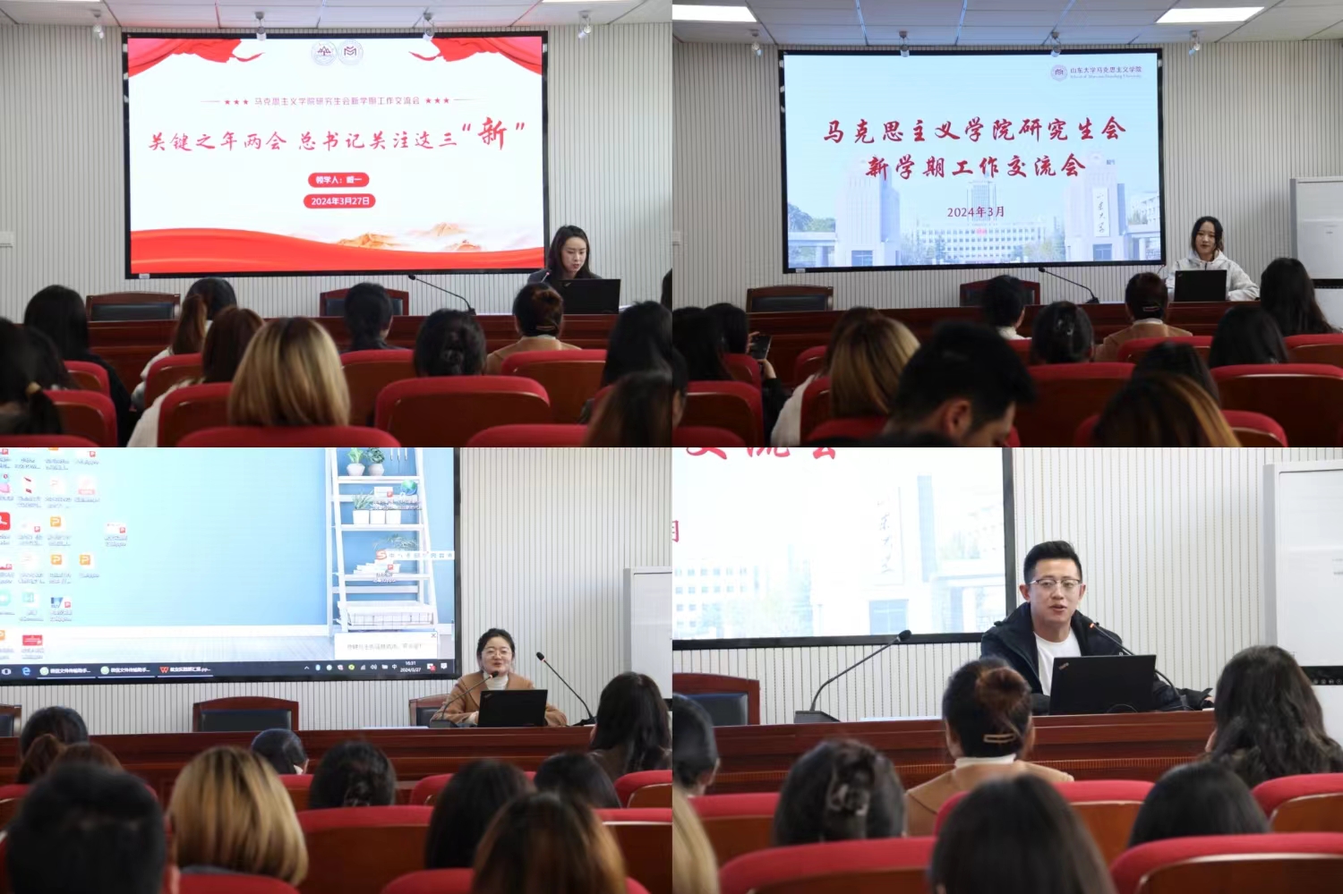 活动伊始,全体成员集中学习2024年全国两会精神,在学习两会新词热点中加深了对全国两会精神的理解,将以更加饱满的热情和更加务实的态度投身科研、工作和实践中。学院第十七届研究生会主席团成员李润哲、邓婉莹、高缘依次分享在研会的成长和收获,激励研会成员用心用情、同向同行、且行且知,在马院研会成为更好的自己,为学校学院发展贡献自己的青春力量,在山大“全面图强”的新阶段展现马院学子的担当。