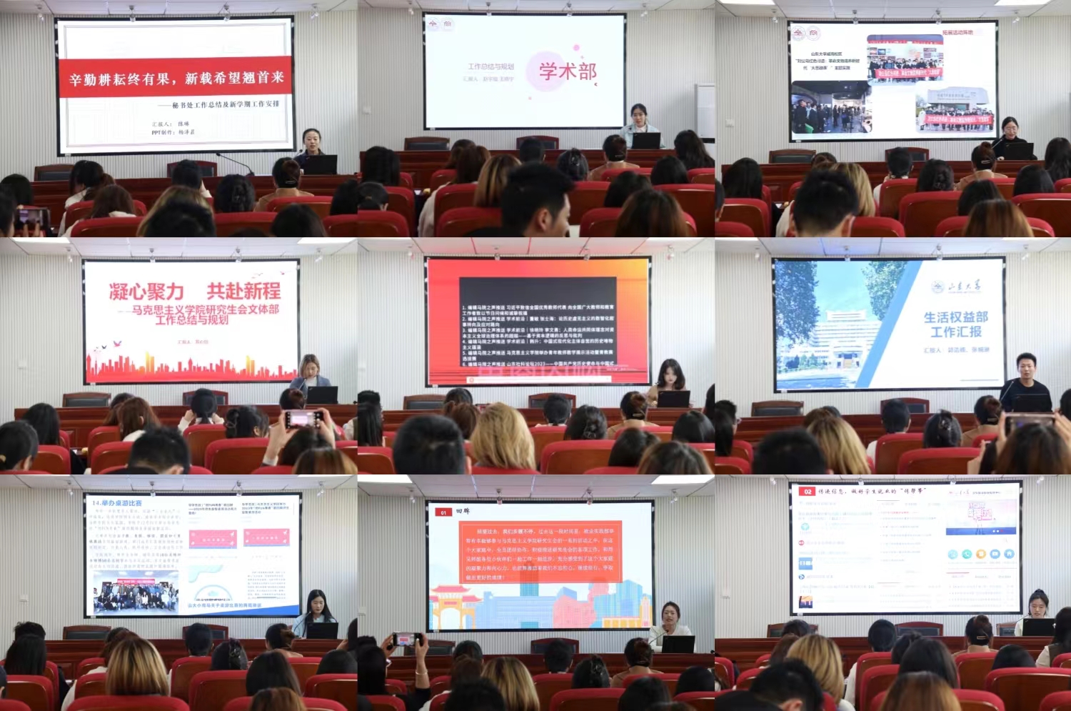 随后,研会各部门代表依次进行部门工作总结回顾和展望。秘书处以“总结和展望”为主线,回顾党史情景剧演绎大赛、“导学思政”下午茶、二级心理辅导站等工作,提出新学期将秉持“干字为先、实字为要、严字托底”的工作理念,保质保量完成各项工作。学术部系统总结举办“导师说”系列讲座和青马学术沙龙、奖学金材料审核等日常工作,提出将不断搭建师生间学术交流平台,努力为学院学术科研工作做好保障。文体部总结过去工作成绩并对新学期的工作进行规划和展望,表示要持续聚焦“导学思政”品牌开展师生羽毛球、篮球、趣味运动会,依托学院“弦歌青马”合唱团开展日常训练、将四个历史时期的代表曲目搬到荧幕舞台,推进学院研究生体育、美育高质量发展。宣传部总结成果反思问题的同时,对未来的工作进行展望,表示要进一步提高宣传质量与效率,创新宣传形式,打造彰显马院特色的宣传平台。生活权益部介绍了开展的各项权益保障工作及举办的包括提案大赛、宿舍文化节、“导学思政”益智桌游活动等品牌特色活动,表示新学期将继续创新权益活动策划和服务项目,以提升同员工活品质、维护同学权益。就业实践部回顾总结毕业生考试报名、“‘职’引未来”等活动的开展情况,提出在新学期将坚持就业服务常态化,以新思路谋求新发展,继续举办老员工职业规划大赛、就业经验分享会、选调国考训练营、思政教师岗模拟试讲等特色活动,全力以赴助力毕业生实现更高质量就业。各部门的汇报展示充分展现了学院第十七届研究生会全体成员积极阳光、踏实肯干的品质特质,乐于奉献、敢于担当的工作氛围,争先争优、勇往直前的理想追求,为研究生会后续工作打下良好的基础。